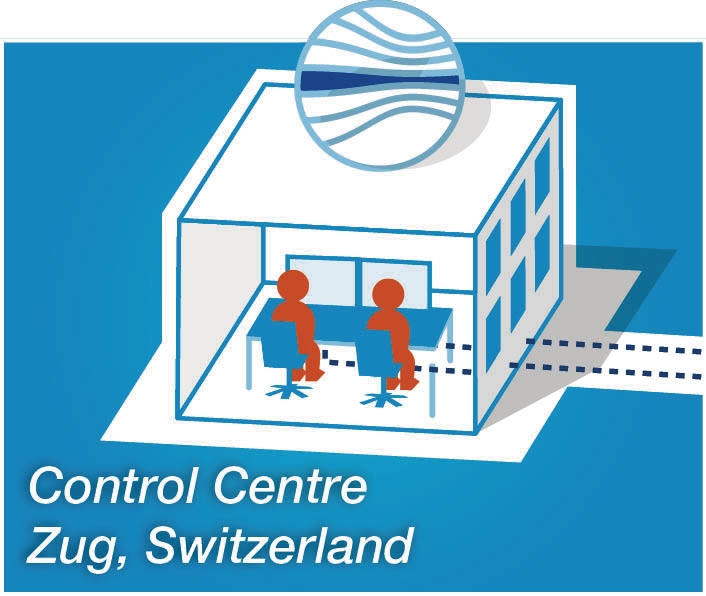 The operation of the pipelines is overseen from the Control Centre at the Nord Stream headquarters in Zug. Operators are in constant contact with the supplier of the gas as well as the receivers to assess the flow of gas on a daily basis. The control system is linked via a dedicated cable and satellite connection to the sensors and valve controls at both landfalls, enabling the operators to monitor all parameters of gas flow. The Control Centre is equipped with a large video wall display, as well as operator and engineering work stations.