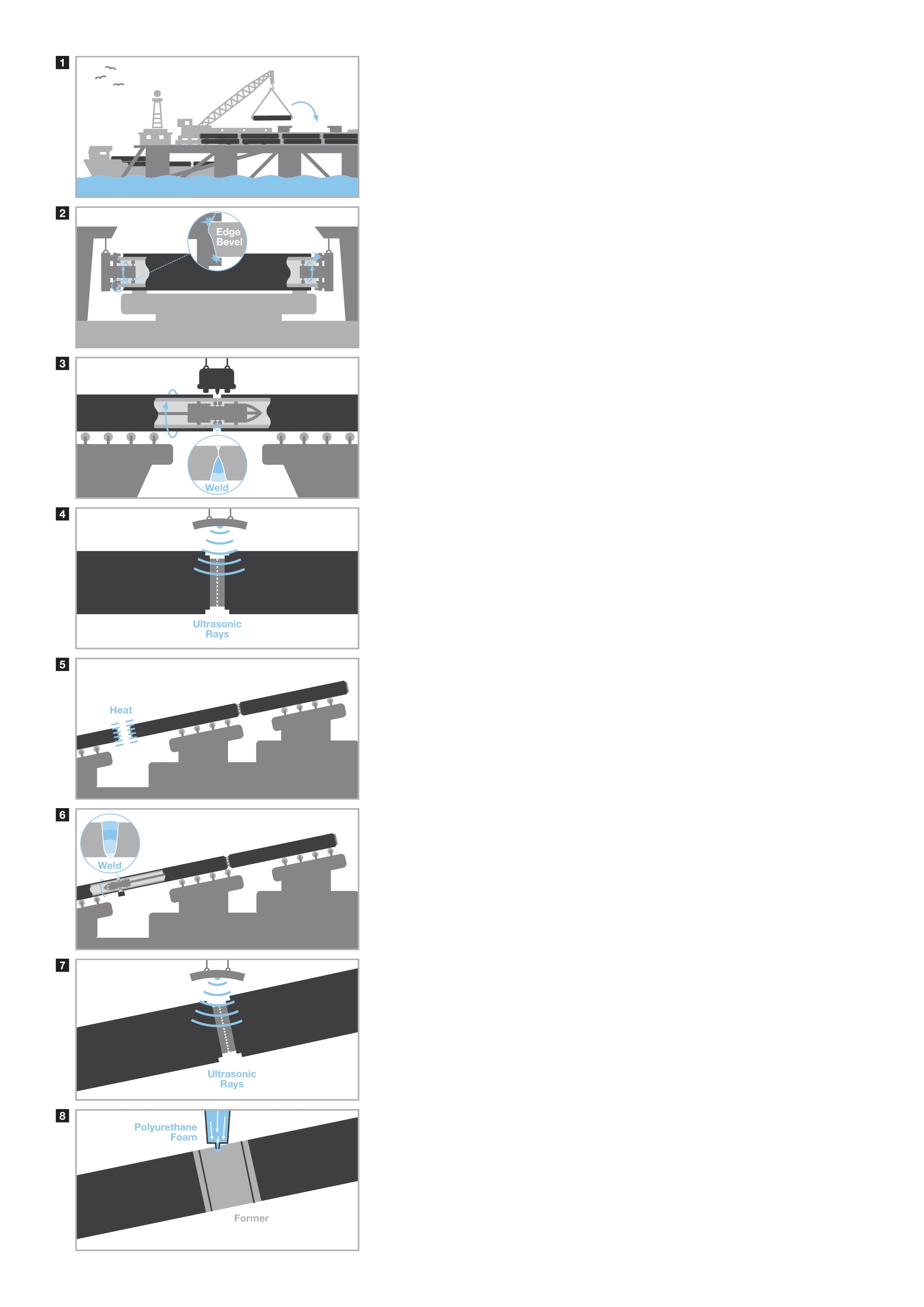 8) Once the weld is confirmed acceptable, a corrosionresistant, heat-shrink sleeve is applied around its entire circumference. Then, polyurethane foam is poured into a mould surrounding the weld area. This foam hardens, providing further protection.