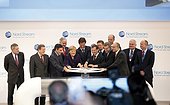 8 ноября 2011 г. | Любмин, Германия | Сегодня первая нитка газопровода «Северный поток» официально введена в эксплуатацию – после четырех лет планирования и 18 месяцев интенсивного строительства. Президент РФ Дмитрий Медведев, Канцлер ФРГ Ангела Меркель, Премьер-министр Франции Франсуа Фийон, Премьер-министр Нидерландов Марк Рютте и член Европейской Комиссии, ответственный за энергетику в ЕС, Гюнтер Эттингер, вместе с руководителями компаний-акционеров, на торжественной церемонии повернули газовый вентиль, открыв путь первым кубометрам газа в газотранспортную сеть Европы. Церемония состоялась в конечной точке газопровода на германском побережье Балтийского моря близ города Любмин, где транспортируемый газ будет поступать в соединительные газопроводы OPAL и NEL. В мероприятии приняли участие более 500 гостей, в числе которых официальные лица стран-участниц проекта и стран Балтийского моря, руководители компаний-акционеров и партнеров проекта.
